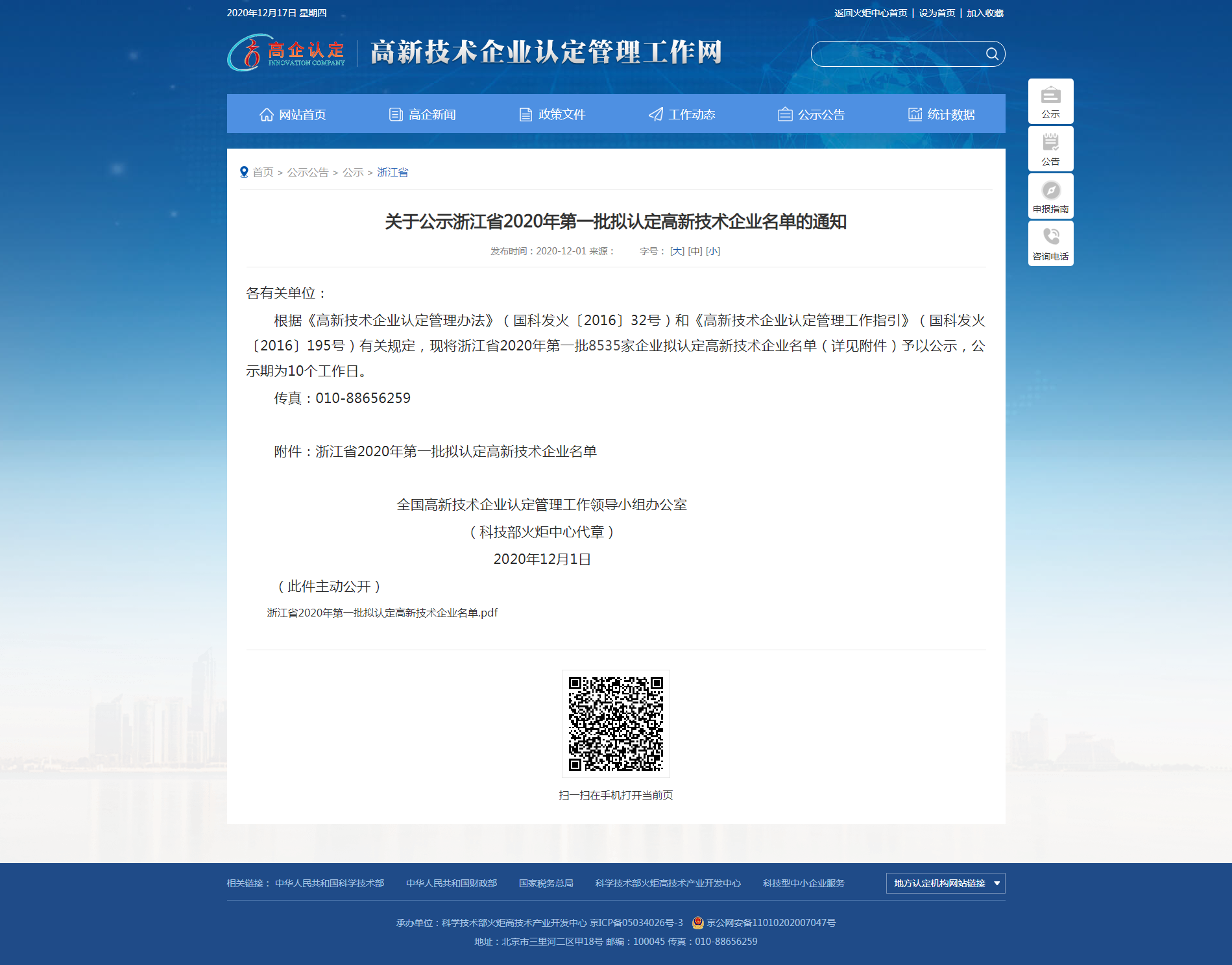 為加大對科技型企業(yè)特別是中小企業(yè)的政策扶持,有力推動大眾創(chuàng)業(yè)、萬眾創(chuàng)新,培育創(chuàng)造新技術(shù)、新業(yè)態(tài)和提供新供給的生力軍,促進經(jīng)濟發(fā)展,根據(jù)《高新技術(shù)企業(yè)認定管理辦法》(國科發(fā)火〔2016〕32號)和《高新技術(shù)企業(yè)認定管理工作指引》(國科發(fā)火〔2016〕195號)有關(guān)規(guī)定,2020年12月1日,全國高新技術(shù)企業(yè)認定管理工作領(lǐng)導(dǎo)小組辦公室發(fā)布《關(guān)于公示浙江省2020年第一批擬認定高新技術(shù)企業(yè)名單》公示,浙江律聯(lián)信息科技有限公司榜上有名。