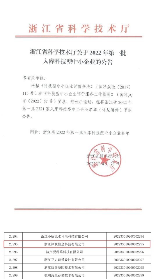 浙江省科學(xué)技術(shù)廳發(fā)布浙江省2022年第一批入庫(kù)科技型中小企業(yè)名單,律聯(lián)科技成功入選。